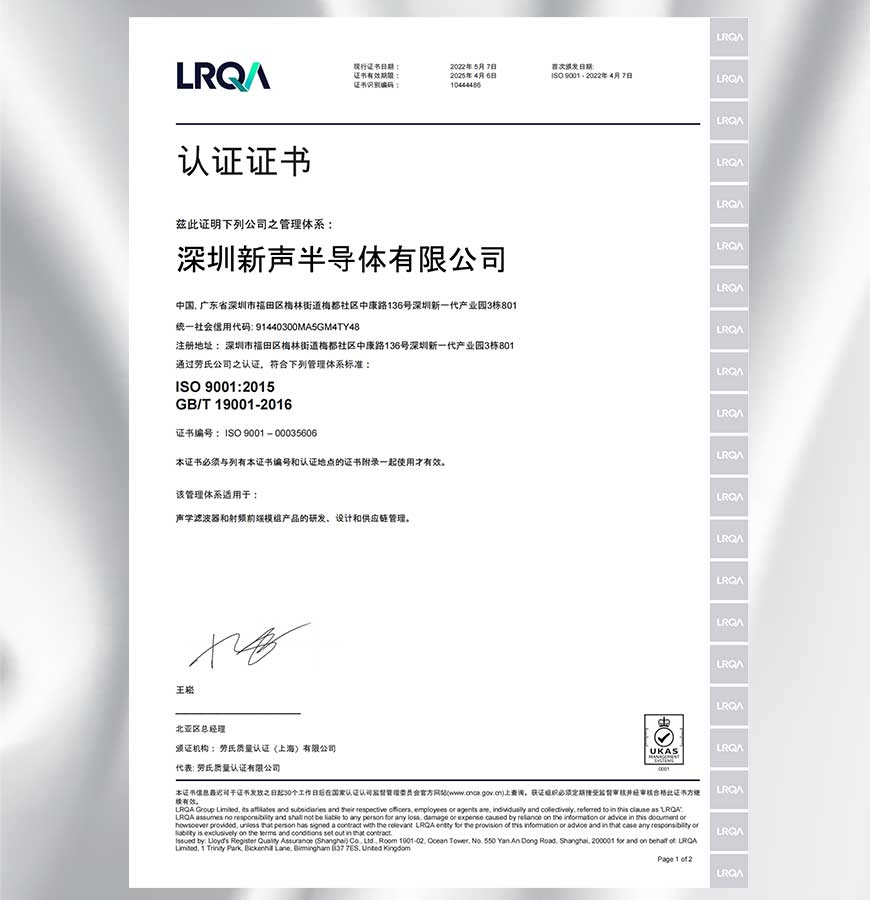 公司全面實(shí)施了企業(yè)資源管理系統(tǒng)(ERP),并通過(guò)了ISO9001質(zhì)量管理體系和ISO14001環(huán)境管理體系認(rèn)證,于2023年底榮獲“專精特新中小企業(yè)”稱號(hào)。2024年10月,新聲半導(dǎo)體TC-SAW和BAW系列多款濾波器產(chǎn)品通過(guò)了AEC-Q200車規(guī)認(rèn)證。