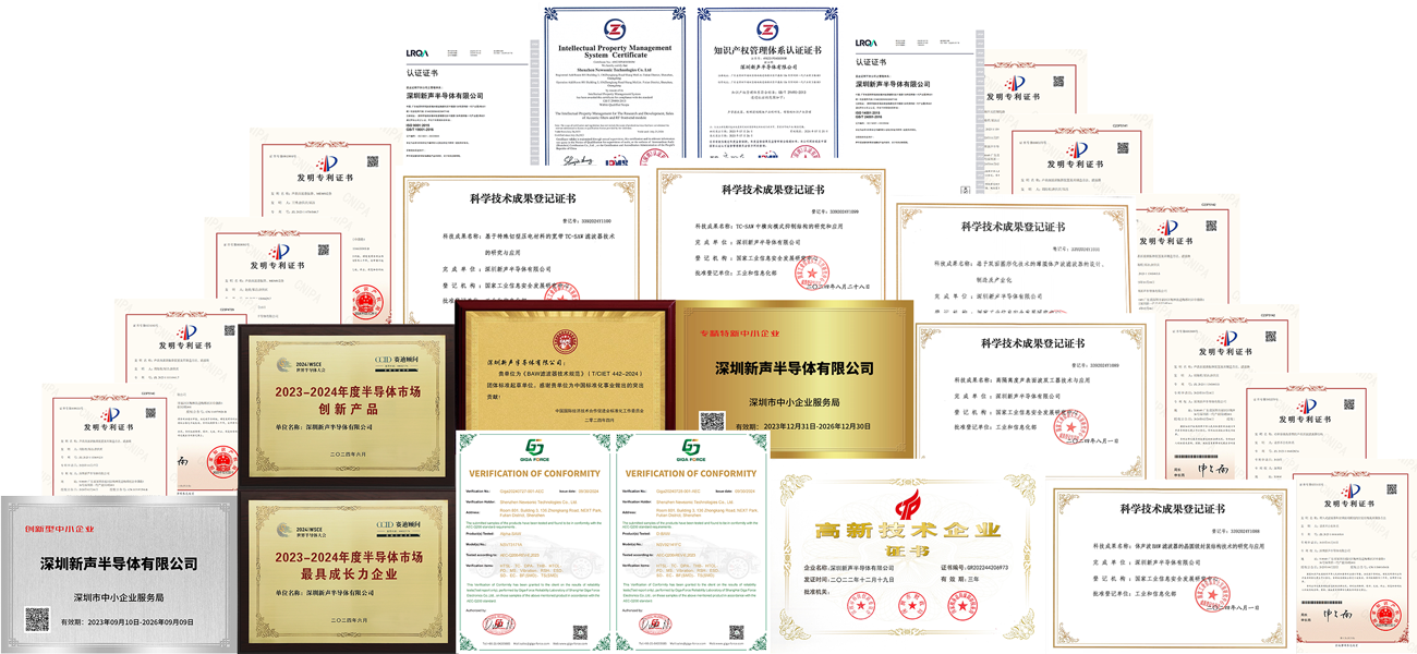 Now the company has been running on a complete ERP system and has passed ISO9001 and ISO14001 qualifications. At the end of 2023, we won the title of "specialized and special new small and medium-sized Enterprise". In October 2024, our TC-SAW and BAW series of filter products passed AEC-Q200 vehicle regulation certification.